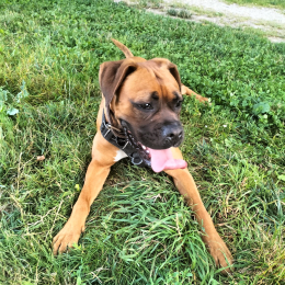 Suki est une staffie de quelques mois. Elle est très joueuse notamment avec les autres chiens et aime se dépenser.